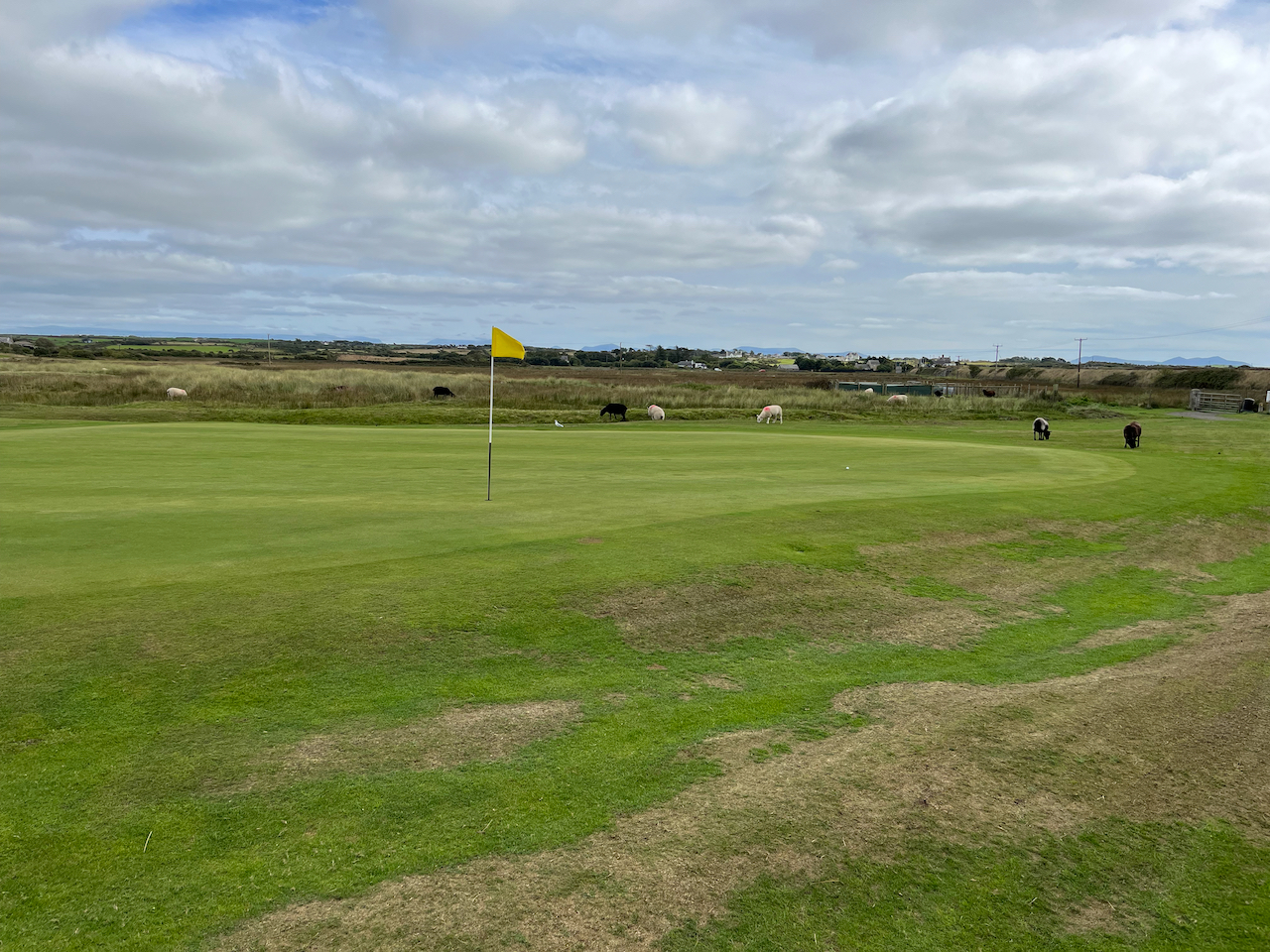 Dort zeigt sich dann der Hauptcharakter des Platzes auf Anglesey. Pures Linksgolf. Viel Abwechslung, immer mal wieder Schafe auf dem Kurs und viel Ginster. Man sollte also schon genau spielen. Erwähnenswert für mich waren als Mann einige doch recht lange Par 4 Löcher. Immer über 400m. Für meine Frau waren das alles Par 5. Daher ist der Platz für Damen auch “nur” ein Par 70. Für Herren dahingegen ein Par 68 von Gelb. Und dafür war dann die auf den ersten Blick geringe Länge mit knapp 5400m wieder im Rahmen.
