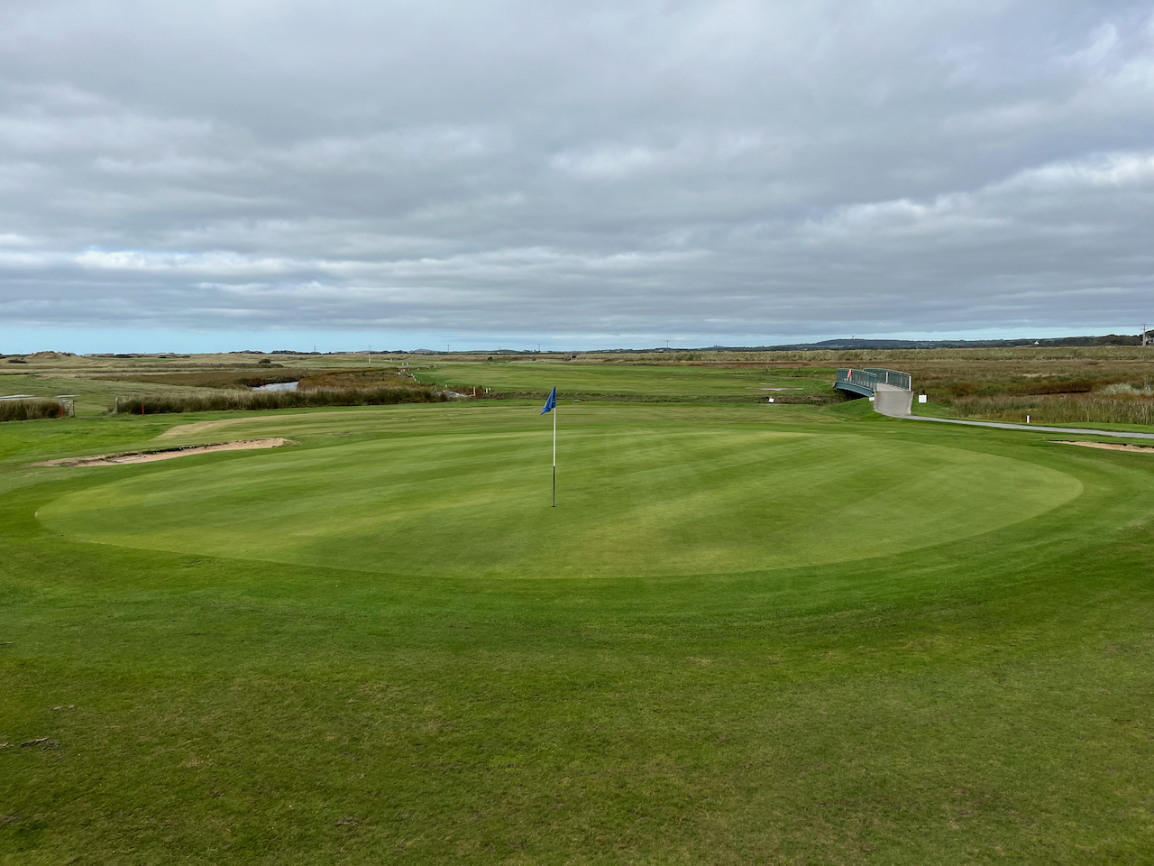 Loch 18 war dann ein mittellanges Par 4, bei dem das Grün hinter einem breiten Graben gelegen ist. Um gut aufs Grün zu kommen, muss man hier schon etwas weiter abschlagen. in anständiges Abschlussloch. Was aber noch mehr im Kopf bleiben wird für Anglesey ist der RAF Stützpunkt. Während wir die 18 spielten, wurde dort gerade durchstarten geübt. Also anfliegen und dann kurz vor dem landen wieder durchstarten. Wenn das mal passiert, ist das ja ok. Bei uns haben das aber 5 Jets durchgehend geübt. Und das war wirklich laut. Wir wollten unser Getränk nach Runde ja erst auf der Terrasse zu uns nehmen, aber irgendwie war das dann doch zu laut.
