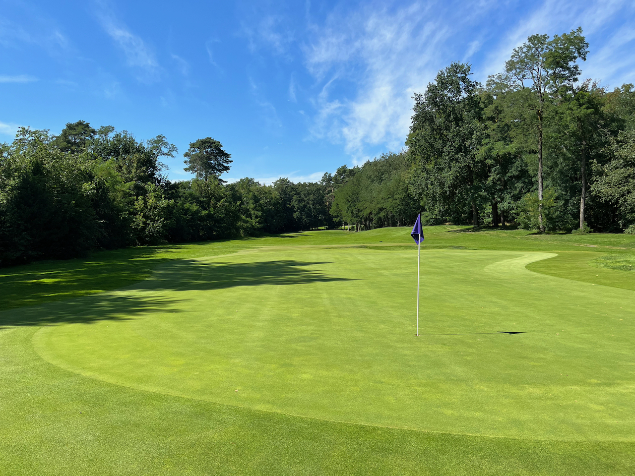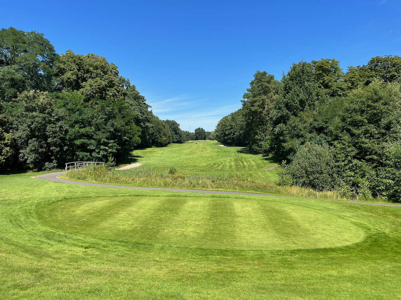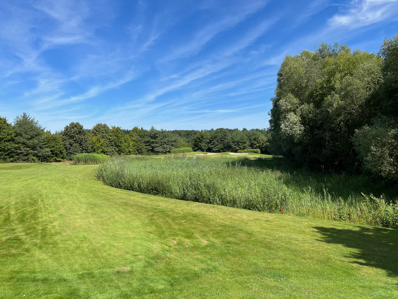 Die zweiten Neun beginnen dann mit einem Par 4, bei dem man beim ersten Mal eine Überraschung erleben kann. Die Landezone ist auf einem kleinen Hügel gelegen. Wer also nicht lang genug ist mit seinem Abschlag und nicht weiß, dass vor dem Grün ein großer Graben ist, kann ein Problem bekommen. Die Bälle sind meist verschwunden, wenn man zu kurz spielt. Trotzdem ein tolles Loch. Auch optisch. Das folgende Par 3 Loch 11 ist auch sehr nett. Knapp 170 Meter von Gelb über einen Teich zu einem gut geschützten Grün. Die Löcher 12 bis 17 sind dann bis auf die zwei Par 3 Löcher eigentlich gerade Autobahnen durch den Wald, die mit ein paar Gräben und Bunkern aufgehübscht sind. Alles nicht schlecht, aber irgendwann freut man sich schon, dass die 18 wieder ein Dogleg war.