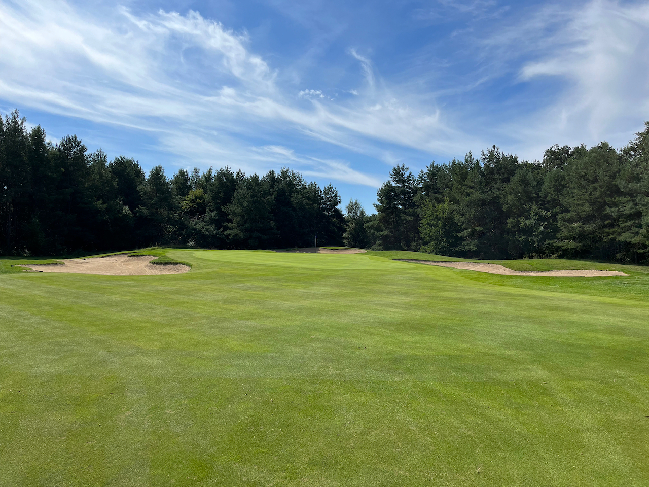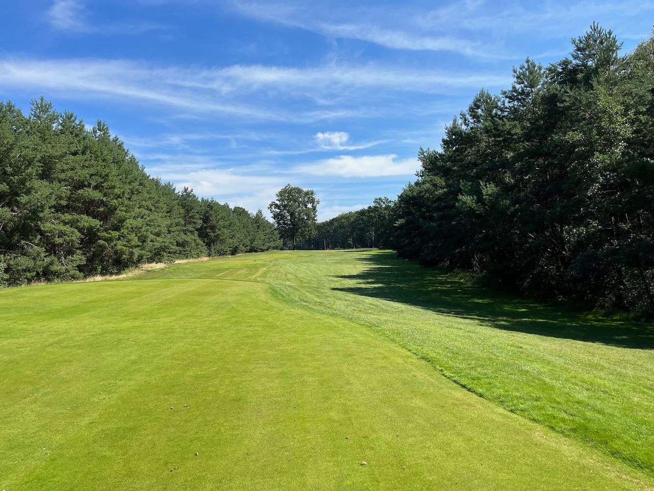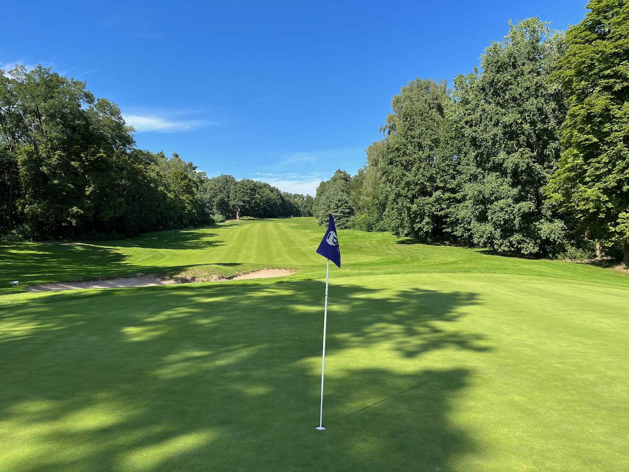 Die zweiten Neun beginnen dann mit einem Par 4, bei dem man beim ersten Mal eine Überraschung erleben kann. Die Landezone ist auf einem kleinen Hügel gelegen. Wer also nicht lang genug ist mit seinem Abschlag und nicht weiß, dass vor dem Grün ein großer Graben ist, kann ein Problem bekommen. Die Bälle sind meist verschwunden, wenn man zu kurz spielt. Trotzdem ein tolles Loch. Auch optisch. Das folgende Par 3 Loch 11 ist auch sehr nett. Knapp 170 Meter von Gelb über einen Teich zu einem gut geschützten Grün. Die Löcher 12 bis 17 sind dann bis auf die zwei Par 3 Löcher eigentlich gerade Autobahnen durch den Wald, die mit ein paar Gräben und Bunkern aufgehübscht sind. Alles nicht schlecht, aber irgendwann freut man sich schon, dass die 18 wieder ein Dogleg war.